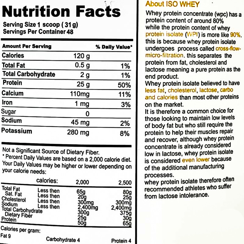 سایر توضیحات | حاوی 25 گرم پروتئین در هر سروینگپایین بودن میزان چربی پروتئین ایزوله در مقایسه با سایر پروتئین ها کربوهیدرات بسیار پایین و نزدیک صفرحل شدن راحت در آب و یا شیرموجب ریکاوری عضلات بدن پس از انجام تمرینات سخت سرعت جذب بالادارای ۹۱ درصد پروتئین آب پنیر خالص زود جذب |