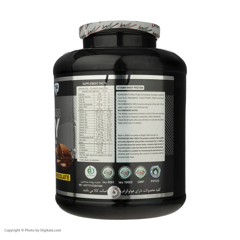 پودر وی پروتئین و پرمیکس ویتامین با طعم شکلاتی پگاه - 2 کیلوگرم یک مکمل غذایی کامل است که پروتئین و ویتامین های مورد نیاز بدن را فراهم می کند. این پودر از اسیدهای آمینه شاخه دار غنی است که به بهبود عملکرد ورزشکاران و افزایش حجم عضلات بدون چربی کمک می کند. این محصول همچنین شامل اسید آمینه های کولین، تائورین، کارنیتین و اینوزیتول است که نقش مهمی در سلامت بدن دارند. پروتئین وی در این پودر نوعی پروتئین است که بدن به راحتی می تواند هضم و جذب کند. هر سروینگ از این پودر حاوی 24 گرم پروتئین است. پودر پروتئین شیر پگاه در فروشگاه دیجی کالا با طعم شکلات است و می توان آن را با آب یا شیر مخلوط کرده و نوشید. این مکمل غذایی برای همه افراد مناسب است و می تواند توانایی جسمی شان را بالا ببرد. قیمت پودر پروتئین پگاه نسبت به نمونه های خارجی بسیار مقرون به صرفه است و تمامی نظرات درباره پودر پروتئین پگاه بسیار مثبت بوده است. با توجه به نیاز شما می توانید به جای پروتئین وی پگاه دیجی کالا، پودر پروتئین پگاه 500 گرم را تهیه کنید.