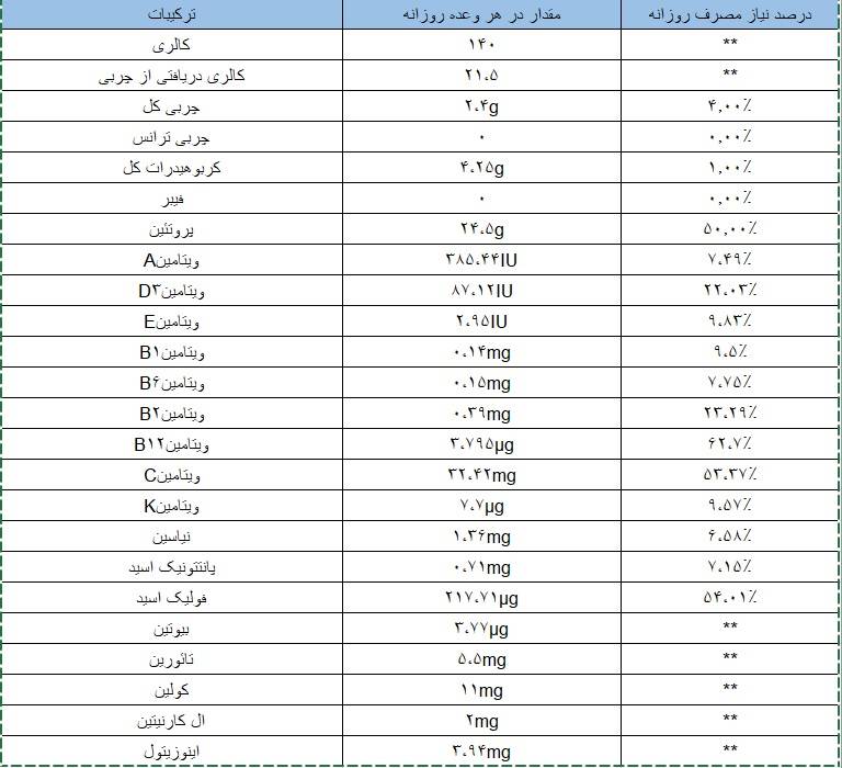 جدول ترکیبات پودر وی پروتیین و پرمیکس ویتامین پگاه
