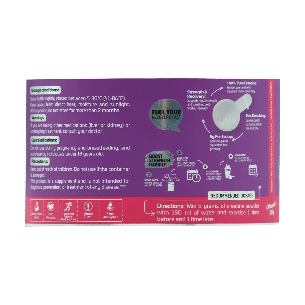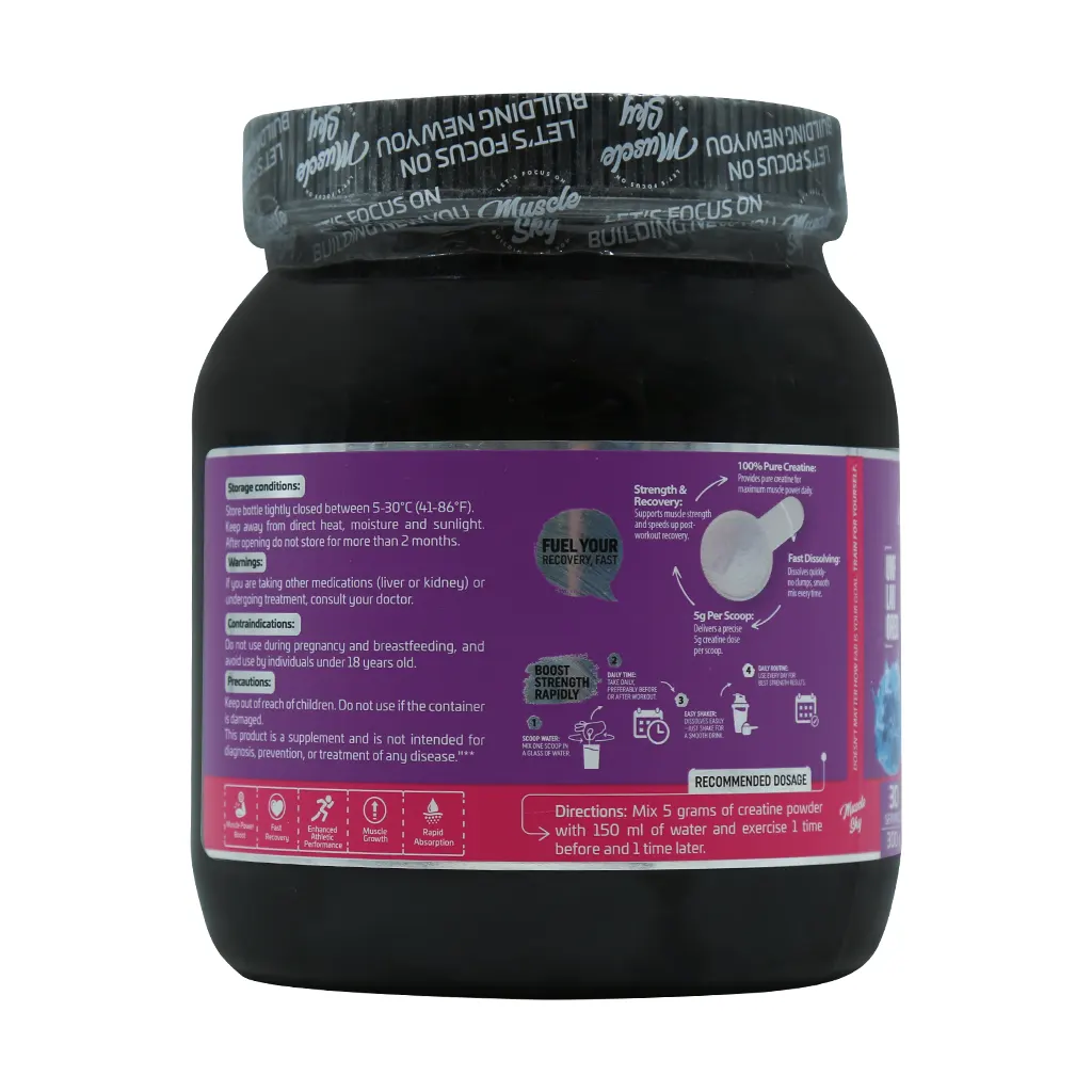 پودر کراتین ماسل اسکای با داشتن دوز مناسبی از کراتین خالص باکیفیت به عضله سازی و حفظ سلامت عضلات، افزایش انرژی و قدرت، تسریع در ریکاوری و بهبود عملکرد ورزشی کمک میکند. این مکمل یک گزینه مناسب برای ورزشکاران حرفهای و بدنسازان است.